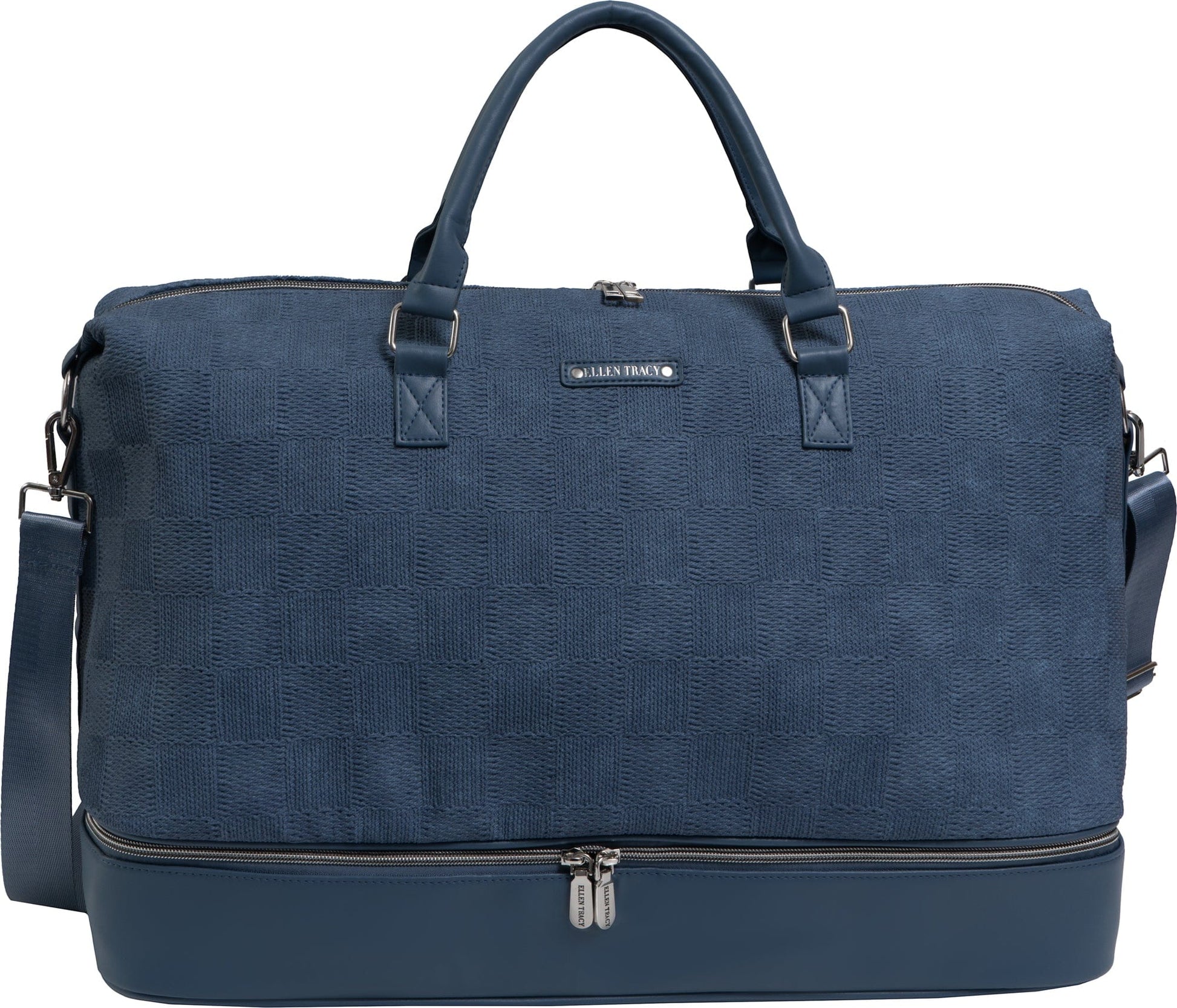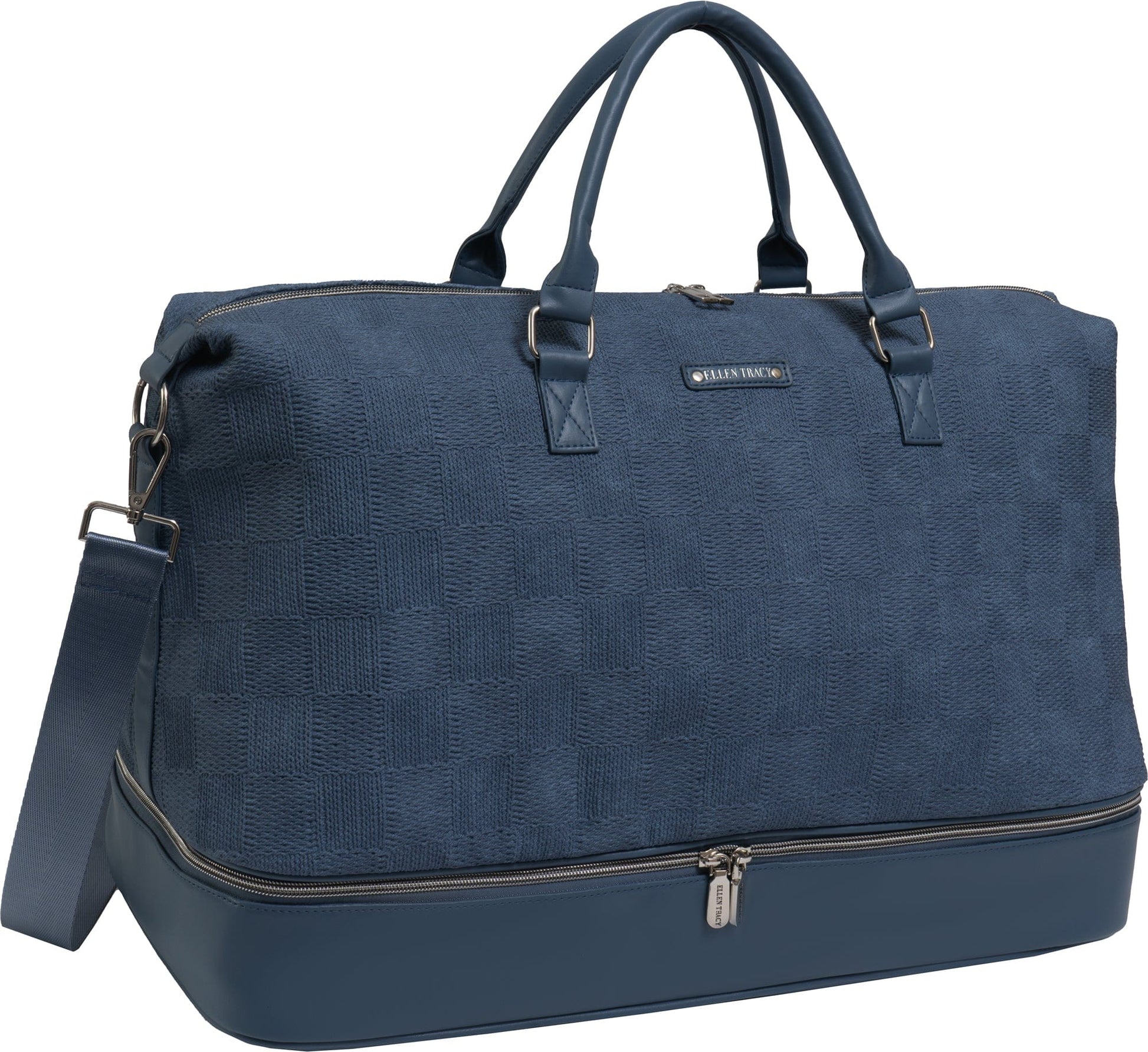 This Ellen Tracy duffle is a travel staple that includes a spacious main compartment and a drop‑bottom shoe compartment, ideal for keeping your shoes or dirty clothes separate from the rest of your belongings. The adjustable and detachable shoulder strap, along with sturdy top handles, offer versatile carrying options to suit your needs.