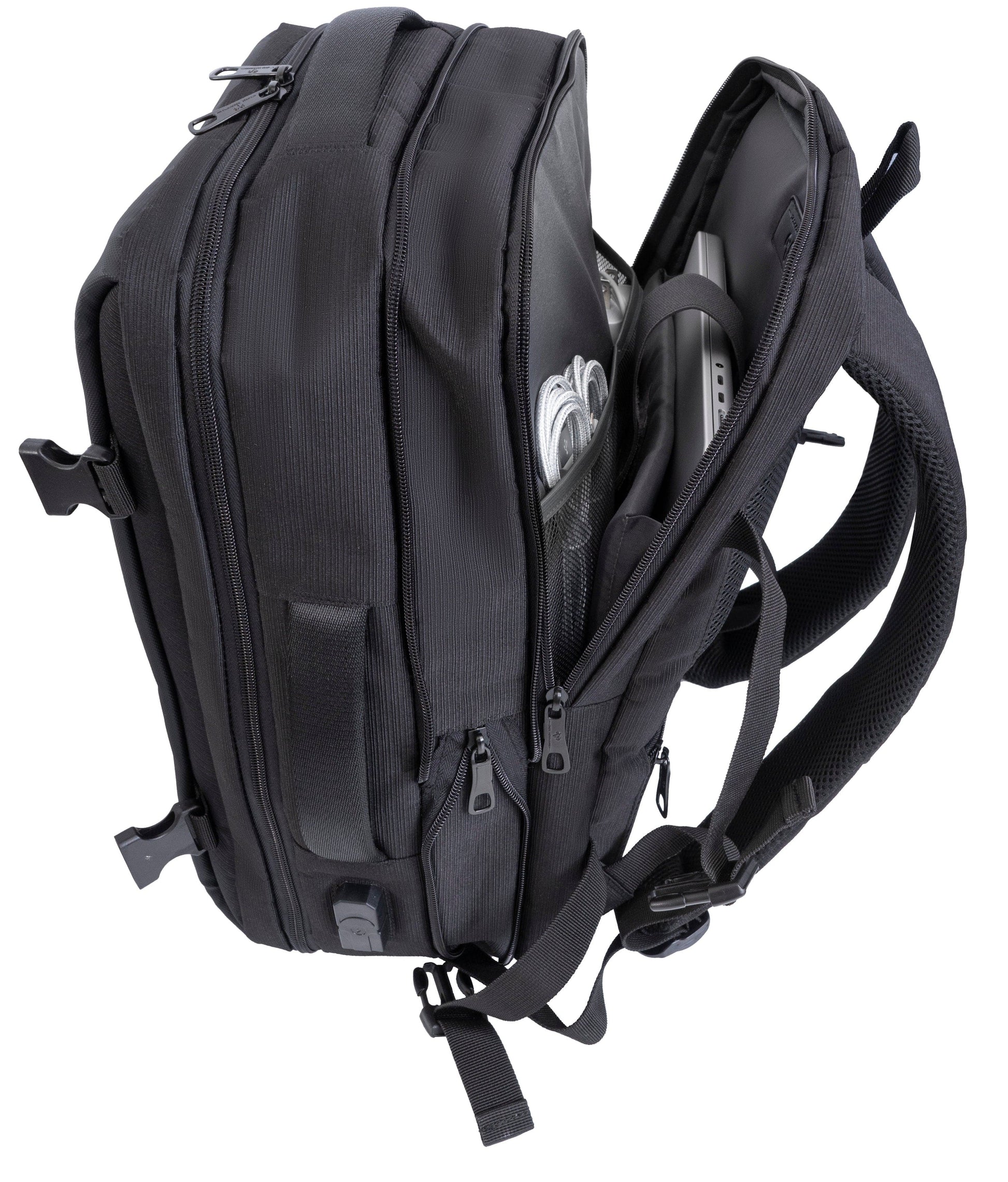 A sleek and durable travel essential, The Jack Abrahams Mitchell Men’s 18-Inch Tarpaulin Expandable Travel Backpack with USB Port is designed for the modern commuter and traveler. Crafted from high-density twill nylon and tarpaulin, it combines rugged durability with a polished look, offering versatile storage and practical functionality for life on the move.